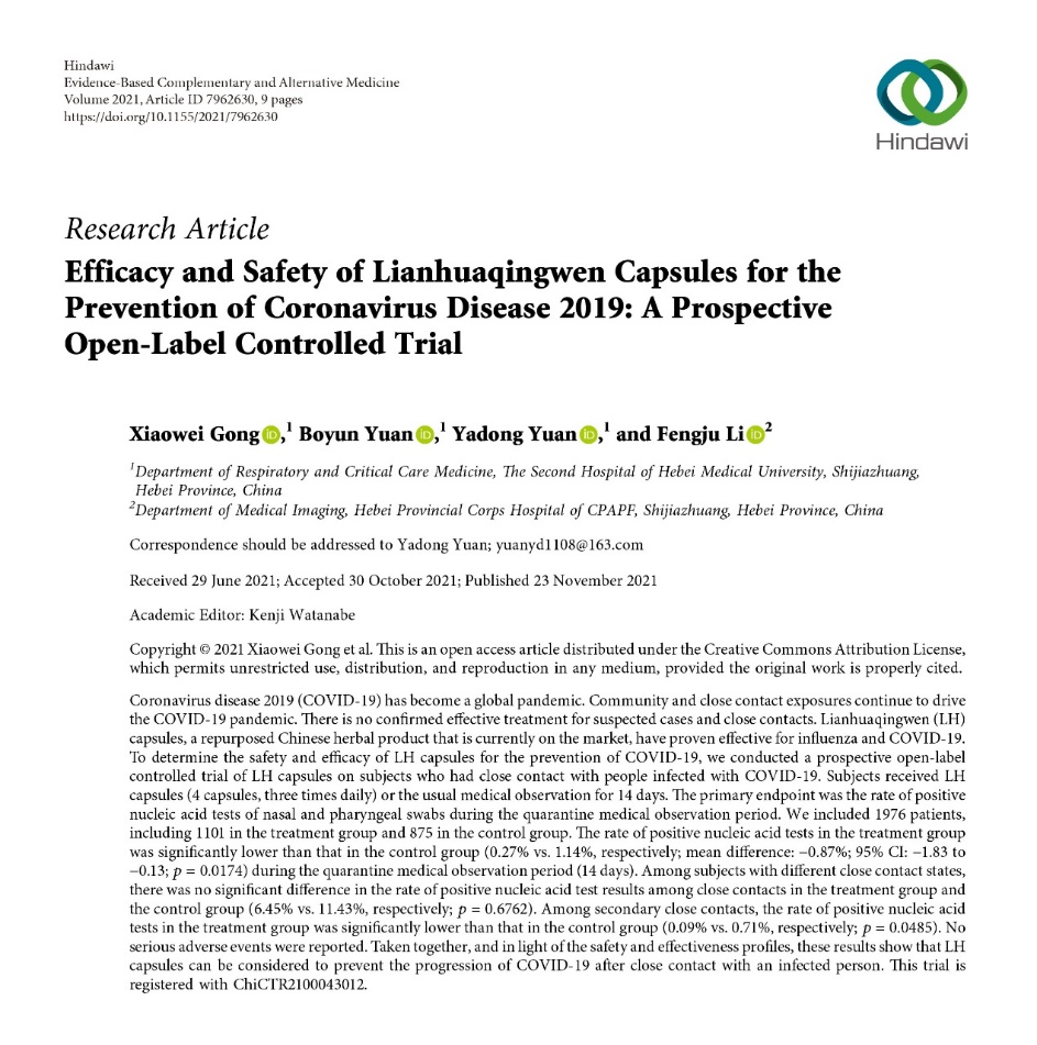 近日,“连花清瘟胶囊预防新型冠状病毒肺炎”真实世界研究论文被国际学术期刊《循证补充和替代医学》刊发,首次证明了连花清瘟胶囊对新冠肺炎密切接触者、次密接触者的有效性和安全性,密接人群应用连花清瘟可降低新冠肺炎阳性感染率达76%。
