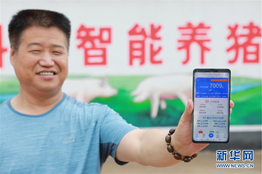 8月7日,河北魏县一家农业企业工作人员用手机APP展示猪场信息。 河北省邯郸市魏县采取“企业+农户”的模式发展智能生猪养殖,喂饲料、给水、清粪等工作实现自动化。养殖新模式加快了生猪养殖标准化、规模化、集约化转型升级。 新华社记者 王晓 摄