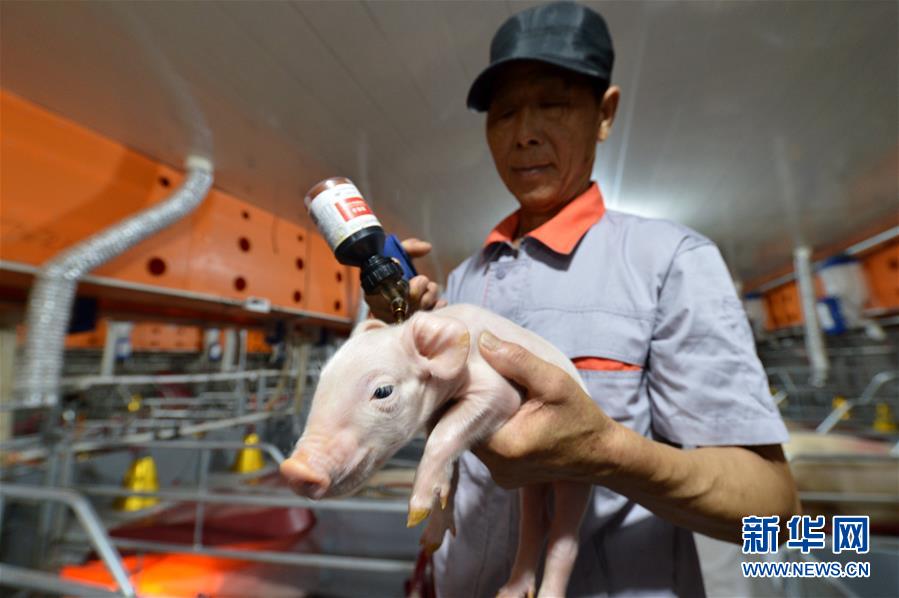 8月7日,河北魏县一家农业企业工作人员在给仔猪注射防疫药品。 河北省邯郸市魏县采取“企业+农户”的模式发展智能生猪养殖,喂饲料、给水、清粪等工作实现自动化。养殖新模式加快了生猪养殖标准化、规模化、集约化转型升级。 新华社记者 王晓 摄