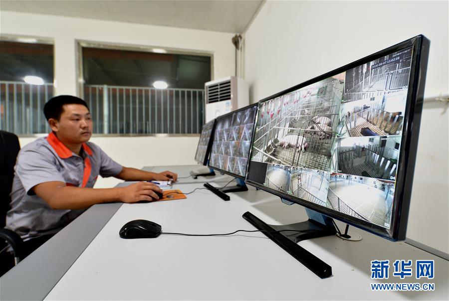 8月7日,河北魏县一家农业企业工作人员在监控屏幕前工作。 河北省邯郸市魏县采取“企业+农户”的模式发展智能生猪养殖,喂饲料、给水、清粪等工作实现自动化。养殖新模式加快了生猪养殖标准化、规模化、集约化转型升级。 新华社记者 王晓 摄