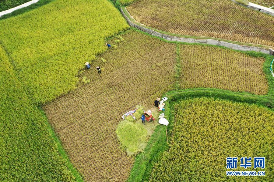 8月9日,在广西三江侗族自治县良口乡南寨村,村民在收割早稻(无人机照片)。 立秋过后,广西三江侗族自治县种植的早稻进入丰收季节,人们抢抓农时收割早稻。 新华社发(梁克川 摄)