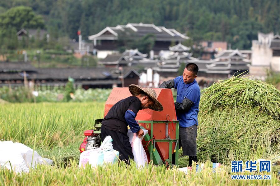 8月9日,在广西三江侗族自治县良口乡南寨村,村民在收割早稻。 立秋过后,广西三江侗族自治县种植的早稻进入丰收季节,人们抢抓农时收割早稻。 新华社发(梁克川 摄)