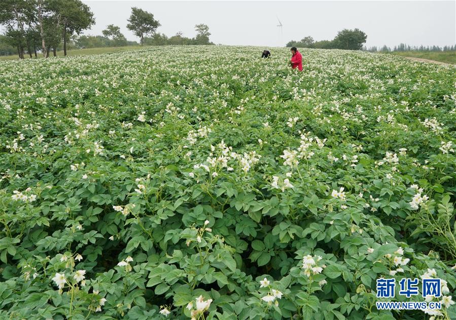 8月12日,在尚义县七甲乡妈奶沟村,农民在田间管护旱作马铃薯。新华社记者 杨世尧 摄