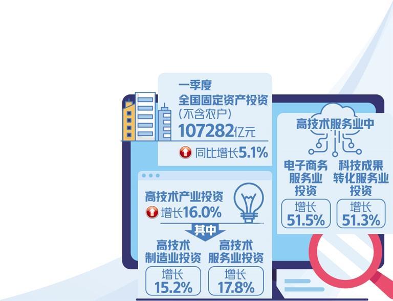 一季度,电子及通信设备制造业、医疗仪器设备及仪器仪表制造业投资,均实现了约20%的增长;与高技术制造业相比,高技术服务业投资增长更快,尤其是电子商务服务业、科技成果转化服务业等行业,投资增速均保持在50%以上。