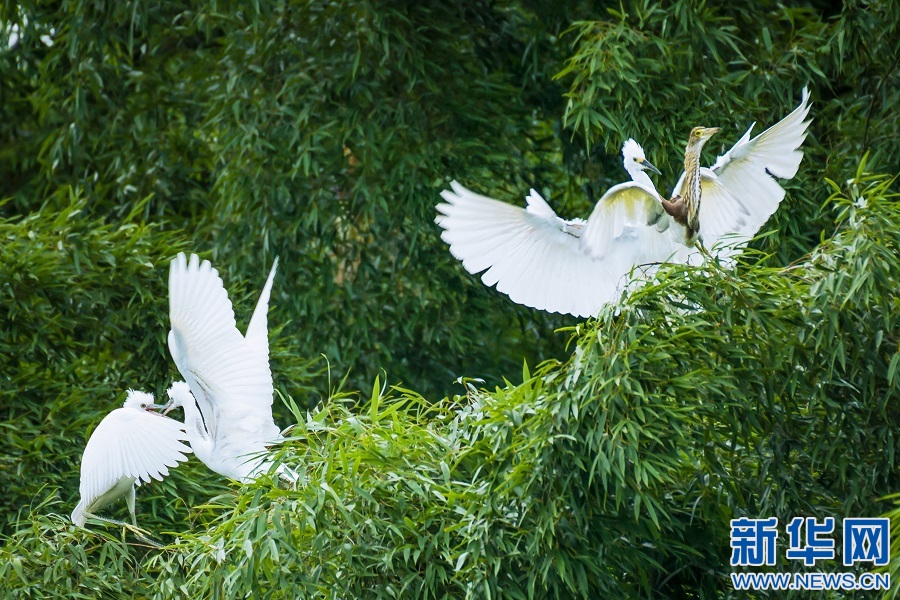 江西省芦溪县新泉乡优美的生态环境吸引了大量白鹭、池鹭前来繁衍栖息、安家落户。新华网发 贺少辉 摄