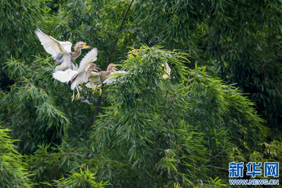 江西省芦溪县新泉乡优美的生态环境吸引了大量白鹭、池鹭前来繁衍栖息、安家落户。新华网发 贺少辉 摄