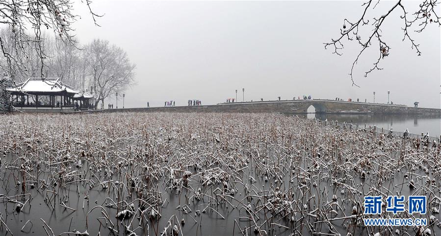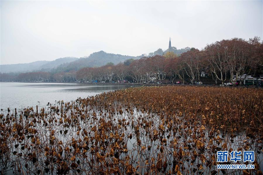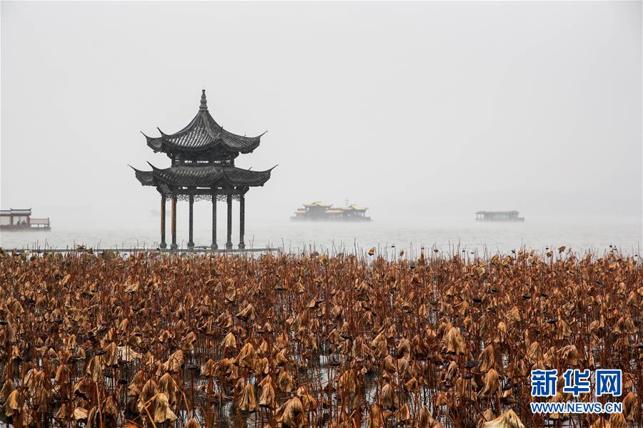 残荷迎初雪,远处保俶塔云雾迷蒙(2018年12月8日摄)。 新华社记者 殷晓圣 摄