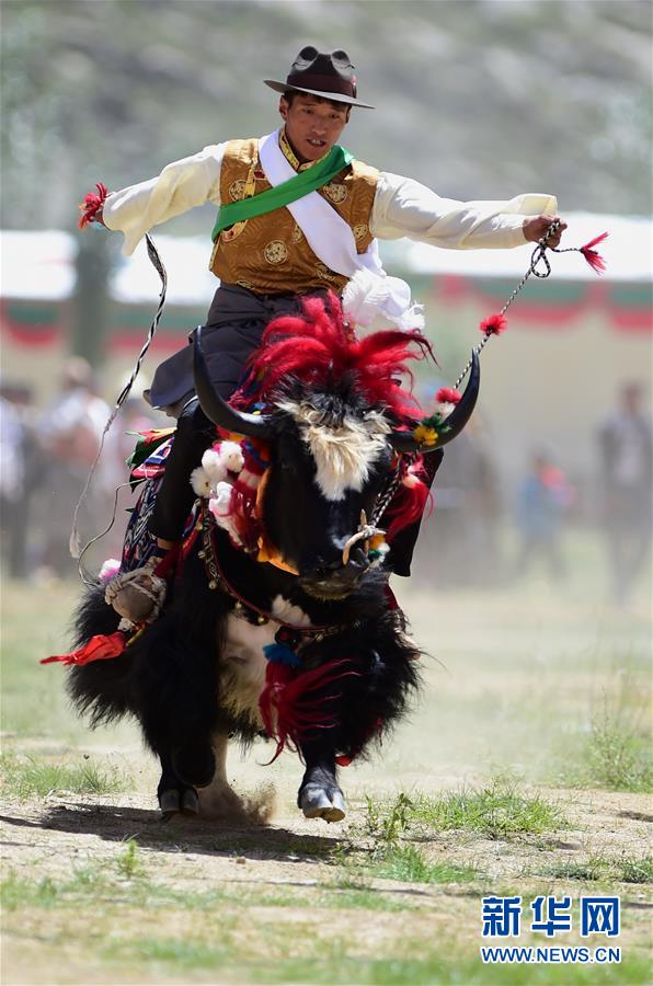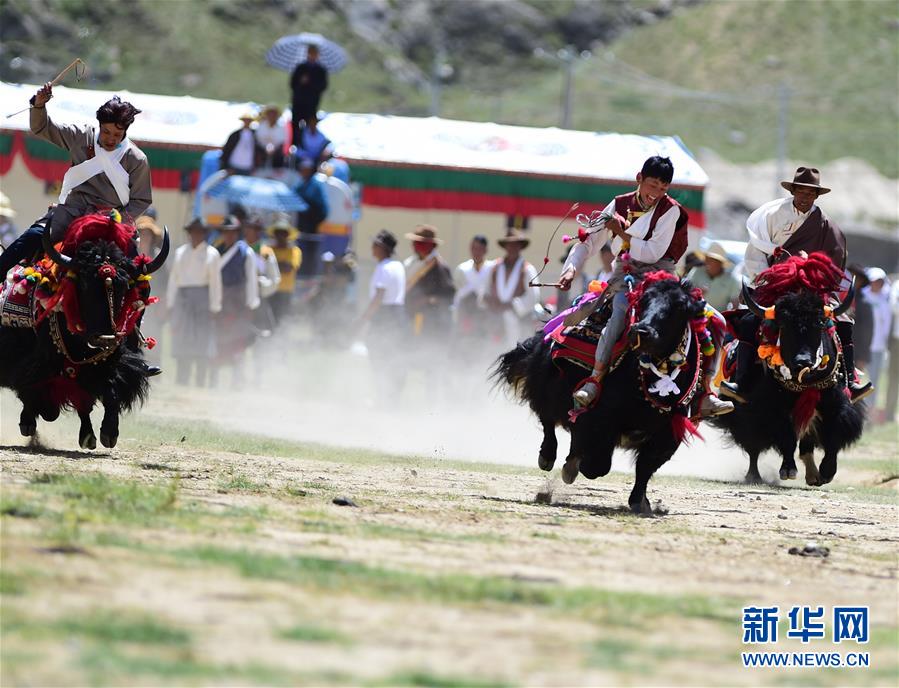 西藏曲水县热堆村村民在赛牦牛(8月7日摄)。 连日来,西藏曲水县农牧民身着盛装,开展赛马、赛牦牛等活动,欢度“望果”节。西藏农区“望果节”是一个在青稞麦田成熟之际,祈求丰收的节日,据传有1500多年的历史,是国家级非物质文化遗产。藏语“望”意为“田地”,“果”为“转圈”。因各地青稞成熟时间不一,“望果节”时间也各异。 新华社发(索朗罗布 摄)