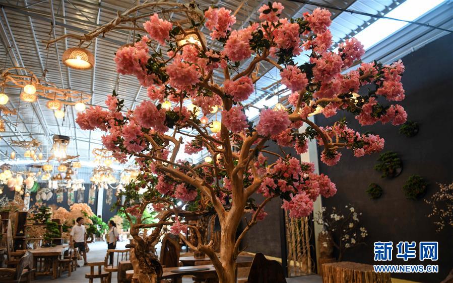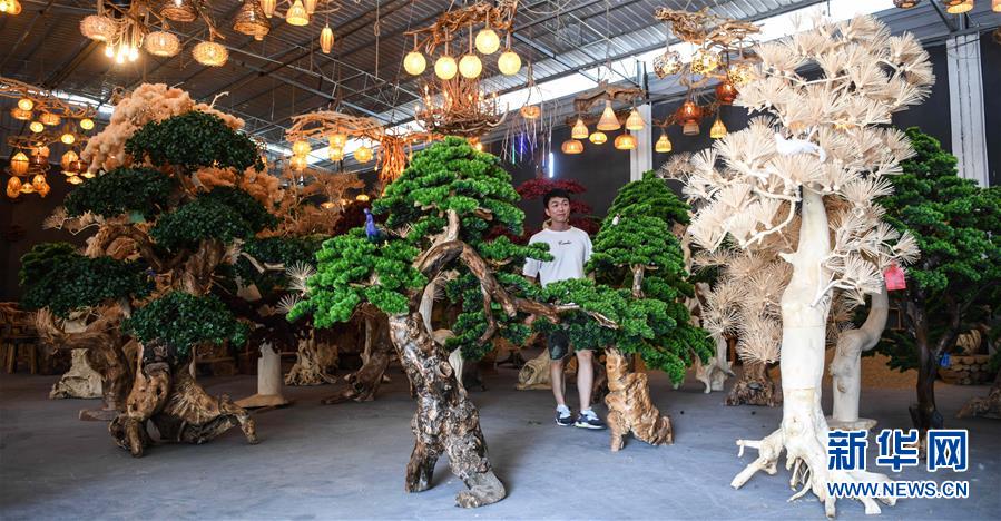 这是8月7日在永福县永安乡根雕工艺品就业扶贫车间拍摄的根雕工艺品。 2017年以来,广西桂林市永福县永安乡通过帮扶返乡青年创业的方式,建立起根雕工艺品就业扶贫车间,组织贫困群众进车间务工学艺,把当地丰富的朽木和柑橘树根枝资源利用起来,加工成盆景、茶桌、吊灯等根雕工艺品,不仅帮助贫困群众在家门口掌握一技之长,还让他们在脱贫摘帽后实现稳定增收。 新华社记者 张爱林 摄