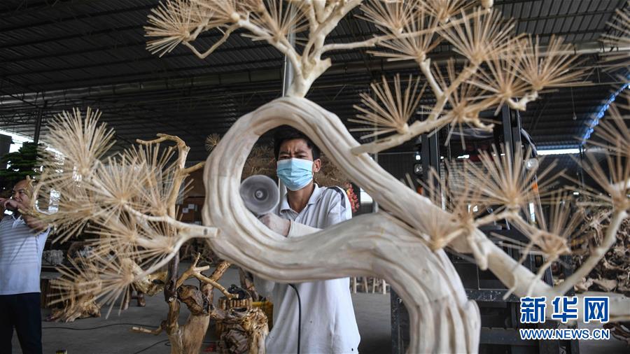 8月7日,工人在制作根雕工艺品。 2017年以来,广西桂林市永福县永安乡通过帮扶返乡青年创业的方式,建立起根雕工艺品就业扶贫车间,组织贫困群众进车间务工学艺,把当地丰富的朽木和柑橘树根枝资源利用起来,加工成盆景、茶桌、吊灯等根雕工艺品,不仅帮助贫困群众在家门口掌握一技之长,还让他们在脱贫摘帽后实现稳定增收。 新华社记者 张爱林 摄