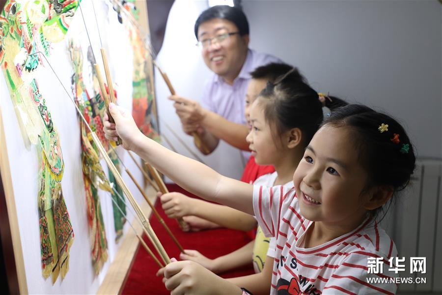 7月27日,皮影传承人周学军在“非遗”小课堂指导孩子们表演皮影戏。暑假期间,河北省唐山市丰润区浭阳街道华府社区开设“非遗”小课堂,邀请民间艺人为辖区中小学生传授剪纸、皮影等技艺,丰富孩子们的暑期生活。新华社发...