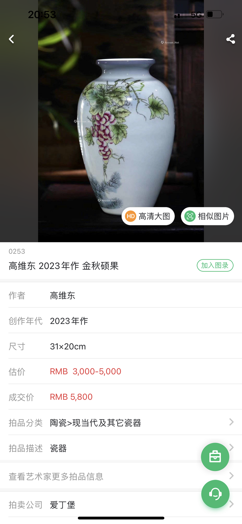 2023年5月2日,爱丁堡拍卖公司举办的爱丁堡中国艺术品交流拍卖专场落下帷幕,国家一级陶瓷设计师高维东创作的瓷瓶《金秋硕果》(拍品编号Lot0253号)主人对杯以5800元人民币成交。 该瓶高30厘米、肚径20厘米,造型挺拔...