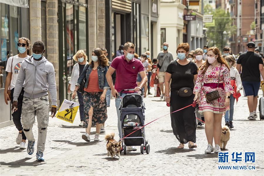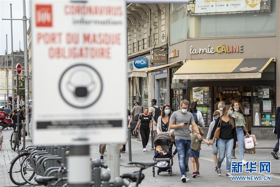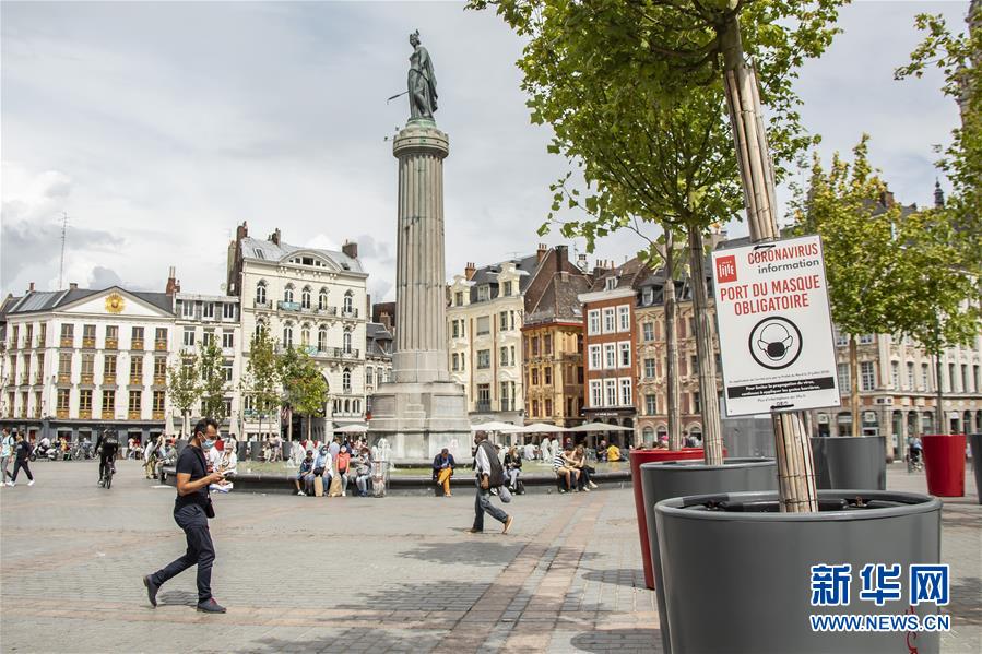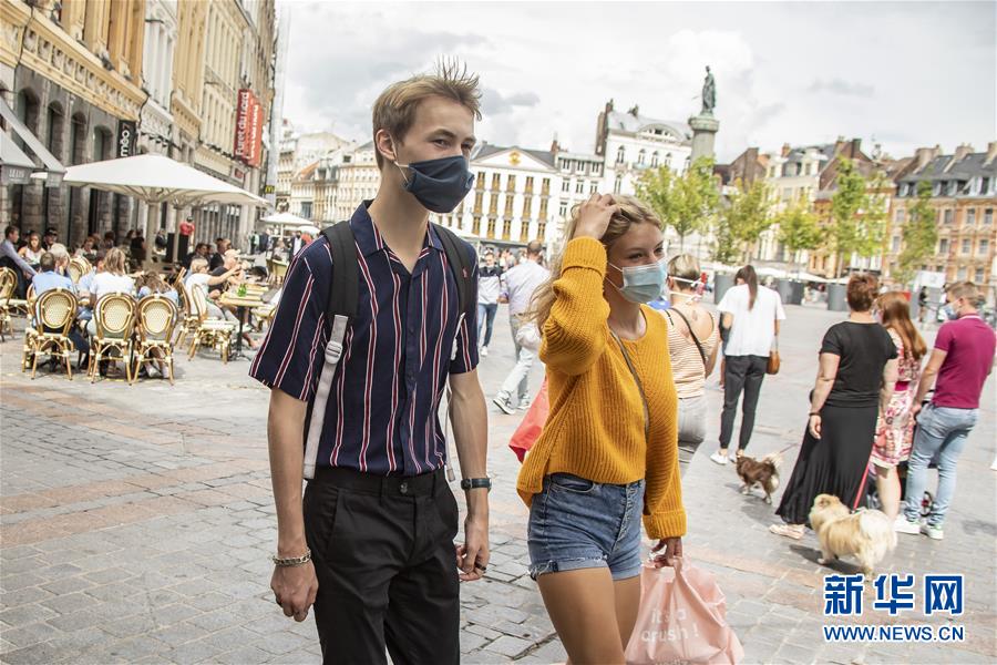 8月3日,在法国北部城市里尔市中心,人们佩戴口罩出行。 随着复工复产进一步推进,法国疫情近期出现反弹,里尔等城市从3日起强制施行“口罩令”,民众在人行道、公园等部分户外公共场所必须佩戴口罩。 新华社发(塞巴斯蒂安·库尔吉摄)