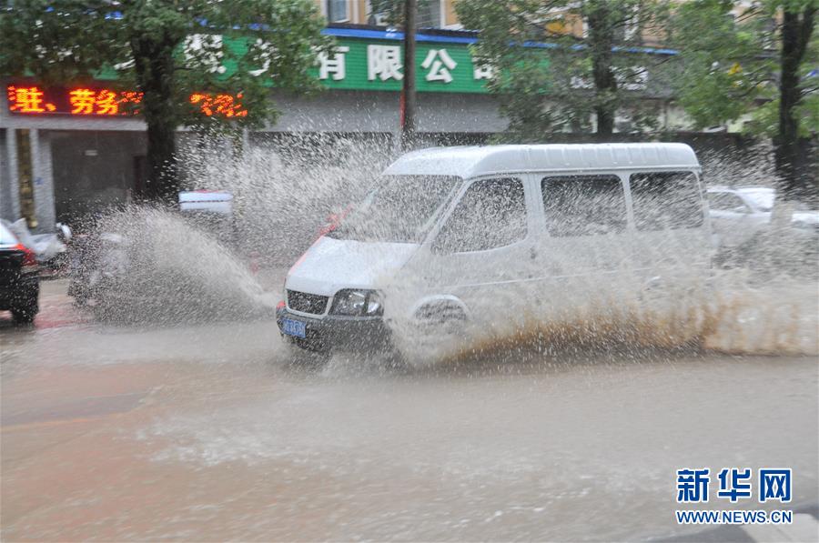 8月4日,车辆行驶在金华市磐安县积水路段。 今年第4号台风“黑格比”于4日凌晨3时30分前后在浙江省乐清市沿海登陆,登陆时强度为台风级。 新华社发(孔德宾 摄)