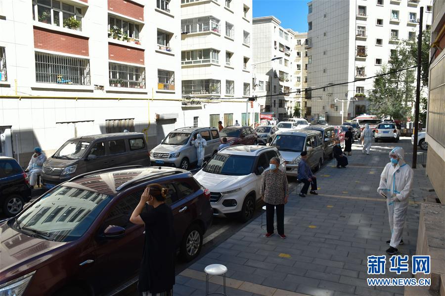 8月5日,居民在乌鲁木齐市天山区山西巷社区排队等待核酸检测。 新华社记者 高晗 摄