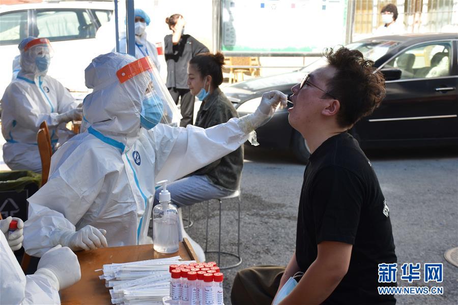 8月5日,医务工作者在乌鲁木齐市天山区山西巷社区,对居民开展免费核酸检测服务。 新华社记者 高晗 摄