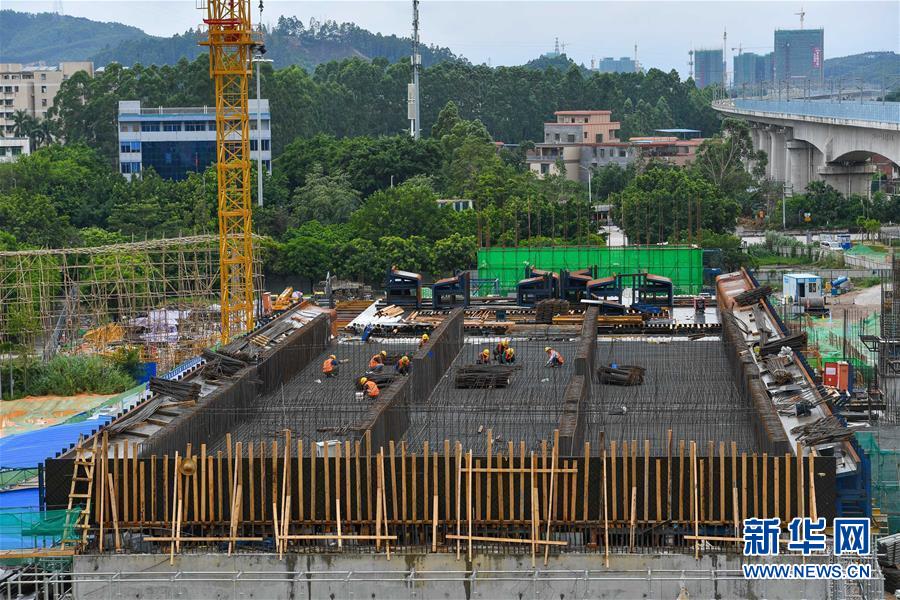 正在建设中的清远磁浮银盏温泉站紧邻广清(广州至清远)城际铁路银盏站(画面右侧,8月5日摄)。 目前,广东首条中低速磁浮线——清远磁浮旅游专线项目建设有序推进。广东清远磁浮旅游专线项目全长约38公里,分两期建设。首期全长8.014公里,将在9月份开始铺轨,预计在2020年底实现主体工程全面完工。 新华社记者 刘大伟 摄