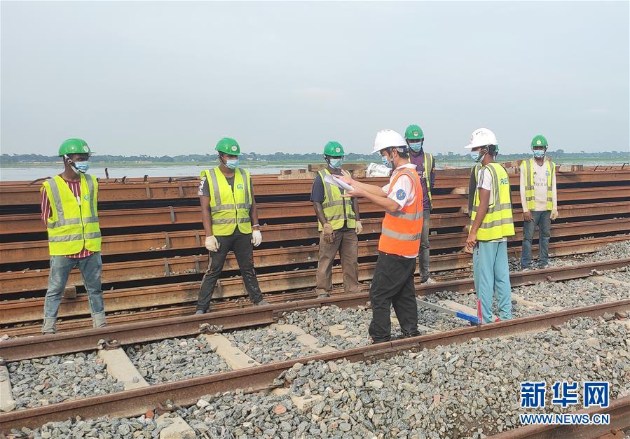 7月27日,在孟加拉国帕德玛大桥铁路连接线项目轨枕生产厂区, 当地员工佩戴口罩参加安全生产培训。新华社发