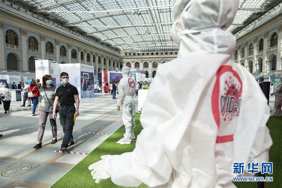 8月11日,人们佩戴口罩在俄罗斯首都莫斯科举行的“国民健康——俄罗斯繁盛之基”论坛上参观。 当日,“国民健康——俄罗斯繁盛之基”论坛在莫斯科开幕,今年论坛的中心议题是在新挑战下如何保护和加强俄罗斯民众的健康。 新华社发(亚历山大摄)