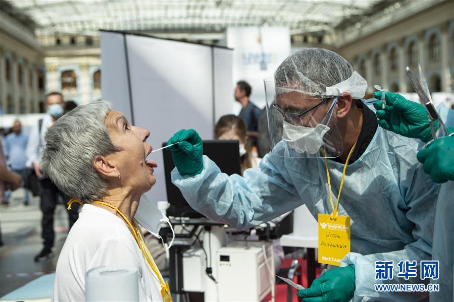 8月11日,一名参观者在俄罗斯首都莫斯科举行的“国民健康——俄罗斯繁盛之基”论坛上接受新冠病毒检测采样。 当日,“国民健康——俄罗斯繁盛之基”论坛在莫斯科开幕,今年论坛的中心议题是在新挑战下如何保护和加强俄罗斯民众的健康。 新华社发(亚历山大摄)