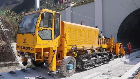 在广西河池市环江毛南族自治县境内的贵南高铁永兴一号隧道附近,中铁十四局几十名职工正熟练地操作牵引铺轨车和推送铺轨设备铺设钢轨。贵南高铁是广西首条设计时速350公里的高速铁路。
