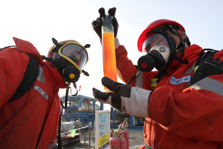 石油工人正在观看富满油田单井中的油样。(中国石油塔里木油田公司供图)