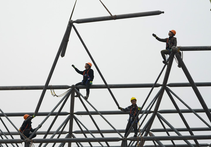 1月23日,在重庆两江新区新能源汽车产业园基础设施配套项目现场,工人在吊车的协助下进行钢结构网架拼装作业。新华社记者 刘潺 摄